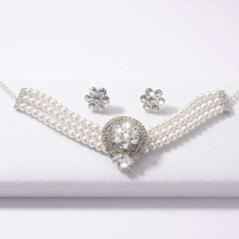 Triple Strand Pearl & Crystal Teardrop Choker Set