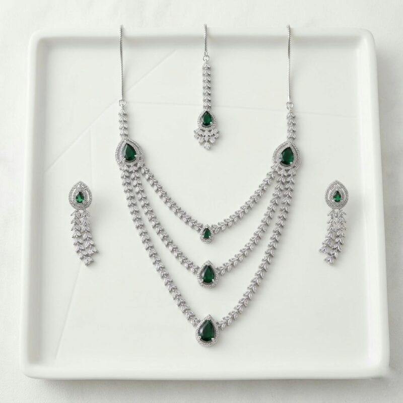Premium 3-Piece Layered Ruby Red & AD Necklace Set with Maang Tikka
