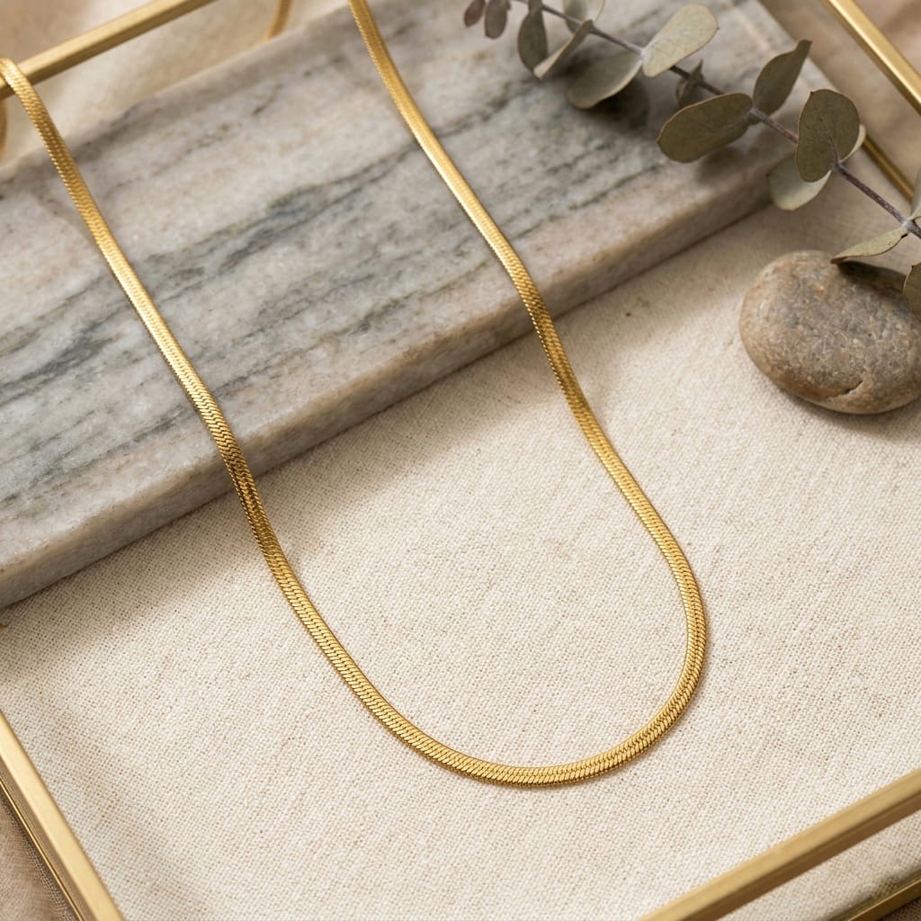 Sleek, fluid, and brilliantly radiant. This essential everyday necklace features a classic flat herringbone design that mimics the look of liquid gold. Finished with a premium 1-gram gold plating and an anti-tarnish coating, it lays perfectly flush against the skin, delivering a sophisticated minimalist aesthetic perfect for solo wear or seamless layering.