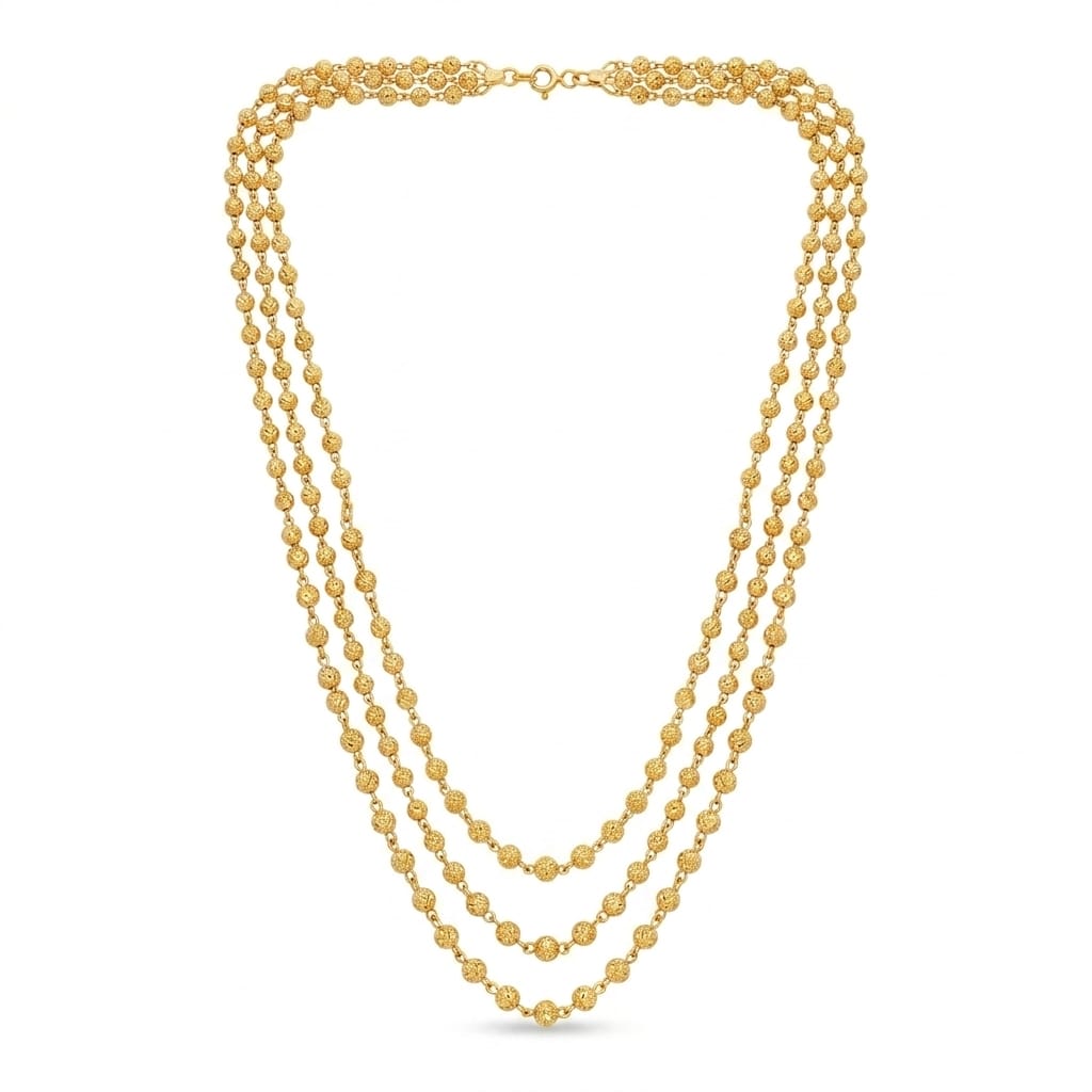 Classic heritage design crafted for lasting brilliance. This pre-layered, three-strand necklace features a premium 1-gram gold plated finish for an authentic, luxurious aesthetic. Detailed with continuous rows of intricately textured, sparkling gold beads, it offers a flawless, high-impact statement for effortless everyday elegance or festive styling.