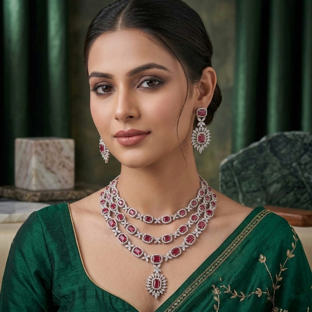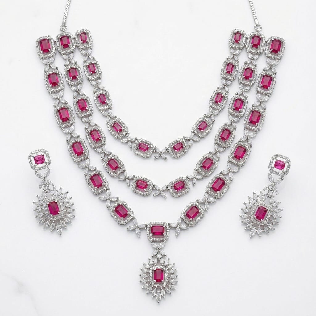 3-Layered Ruby Red & AD Heavy Necklace Set
