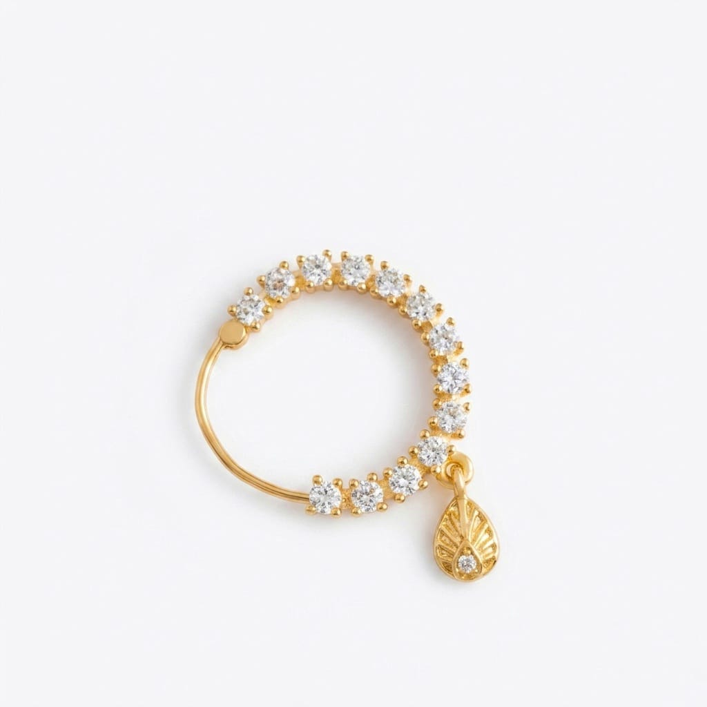 Brilliant sparkle meets heritage charm. This elegant nose ring features a gold-tone hoop completely studded with radiant American Diamonds (AD), finished with a delicately textured teardrop dangle. Lightweight and luxurious, it offers the perfect traditional statement for weddings and festive occasions.