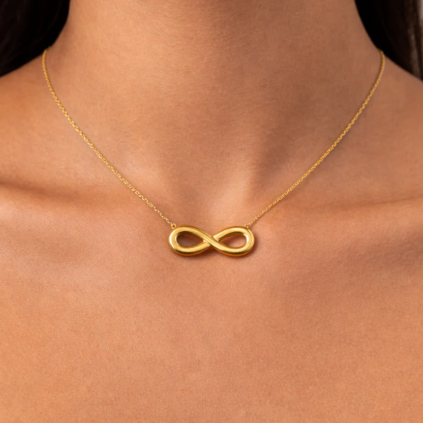 Design Details: A smooth, polished figure-eight infinity symbol, attached at the top curves to sit perfectly flat against the collarbone.
