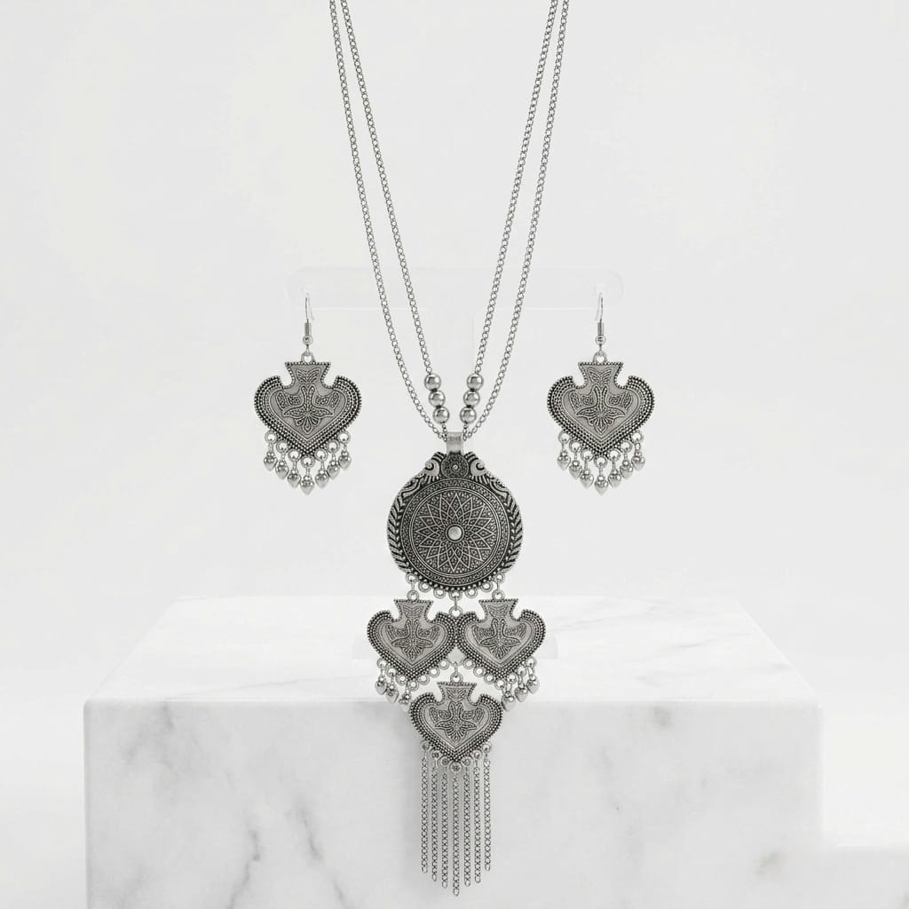 Be the first to review “Antique Silver-Tone Layered Pendant & Earring Set”
