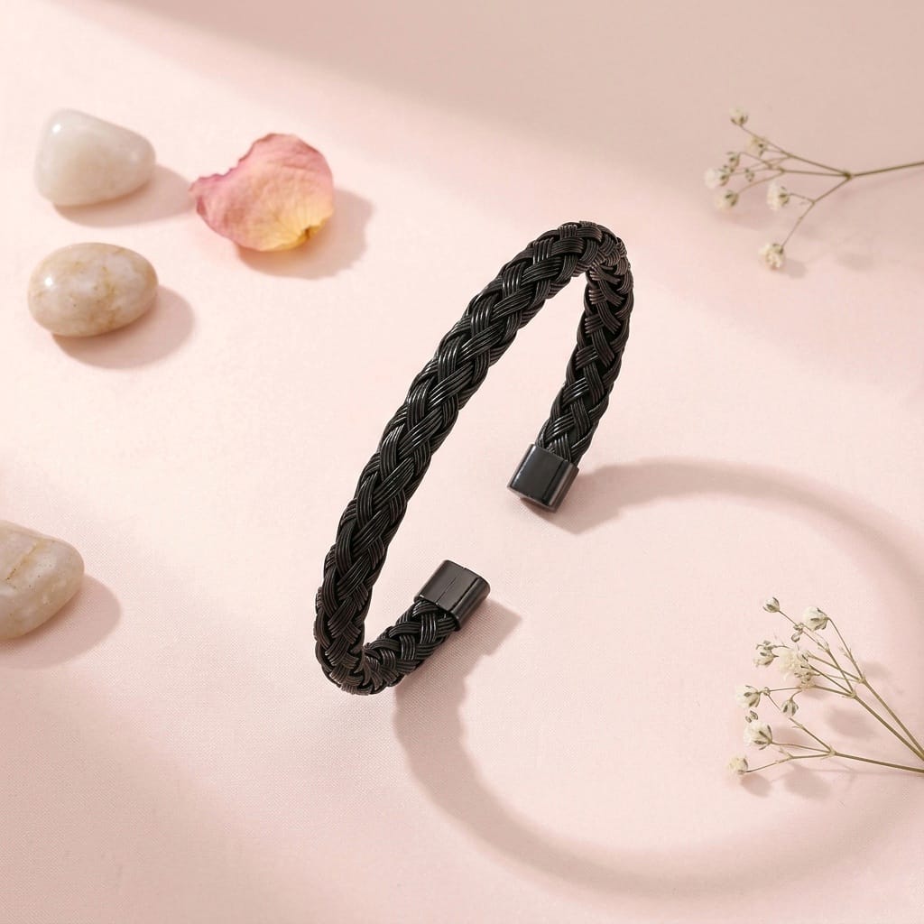 Sleek, textured, and effortlessly modern. This versatile open-cuff bracelet features a tightly braided woven design finished in a striking, deep black. Capped with smooth metal ends for comfort and easy adjustment, it delivers a sophisticated, minimalist aesthetic perfect for daily wear.