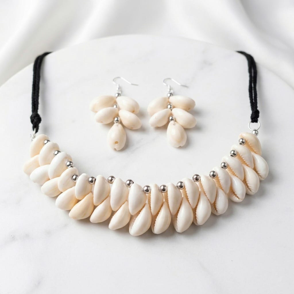 Premium QualityEarthy, textured, and effortlessly bohemian. This tribal-inspired set features a structured collar choker crafted from densely woven natural cowrie shells and silver-tone bead accents. Finished with a comfortable, adjustable black cord and paired with matching shell-cluster earrings, this set is a versatile staple for lovers of coastal and heritage fusion jewelry.