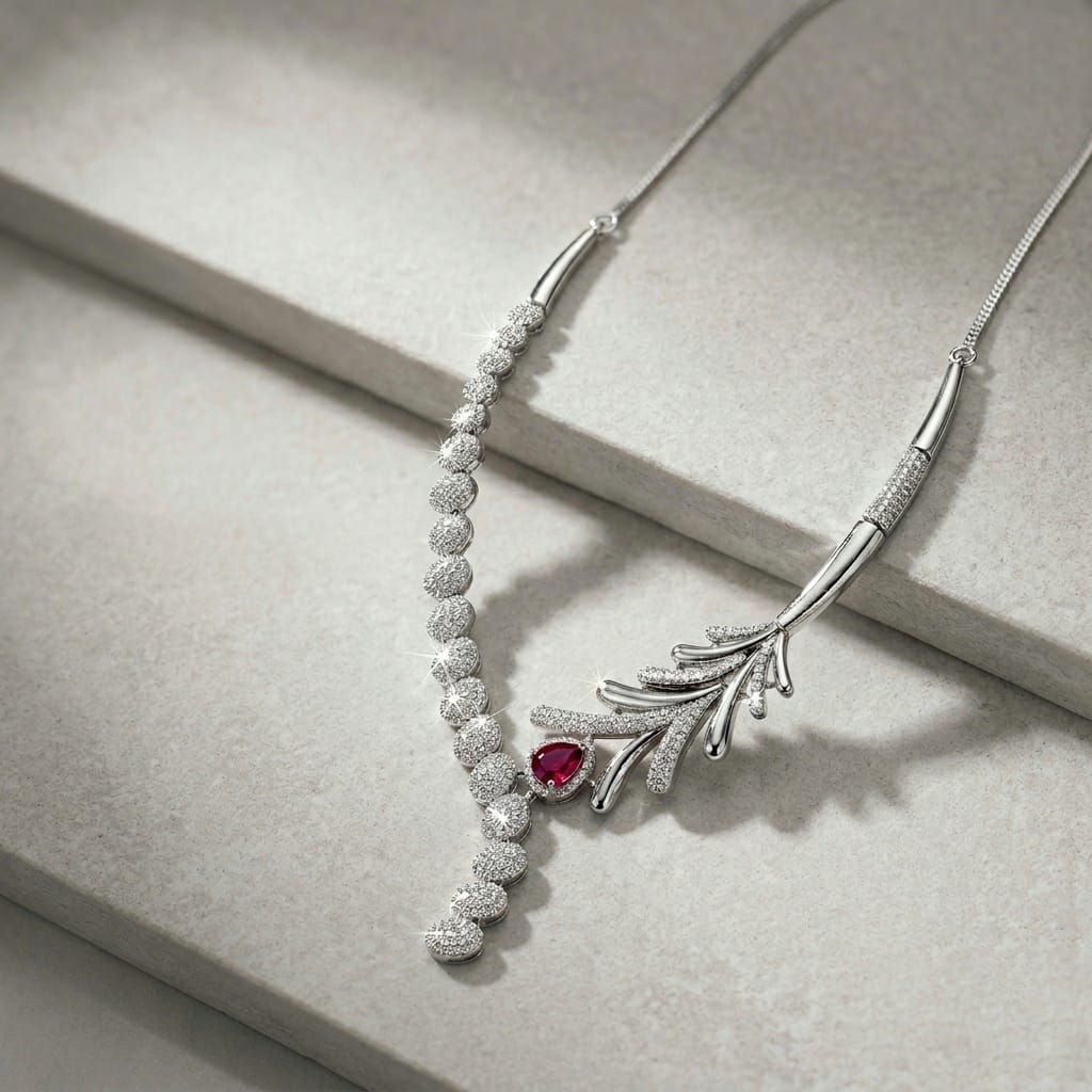 Central Focal Point: The piece features a vibrant, pear-cut red gemstone (resembling a ruby or garnet) at its heart. The stone is nestled within a stylized, leaf-like or wing-shaped setting that sweeps out to one side.