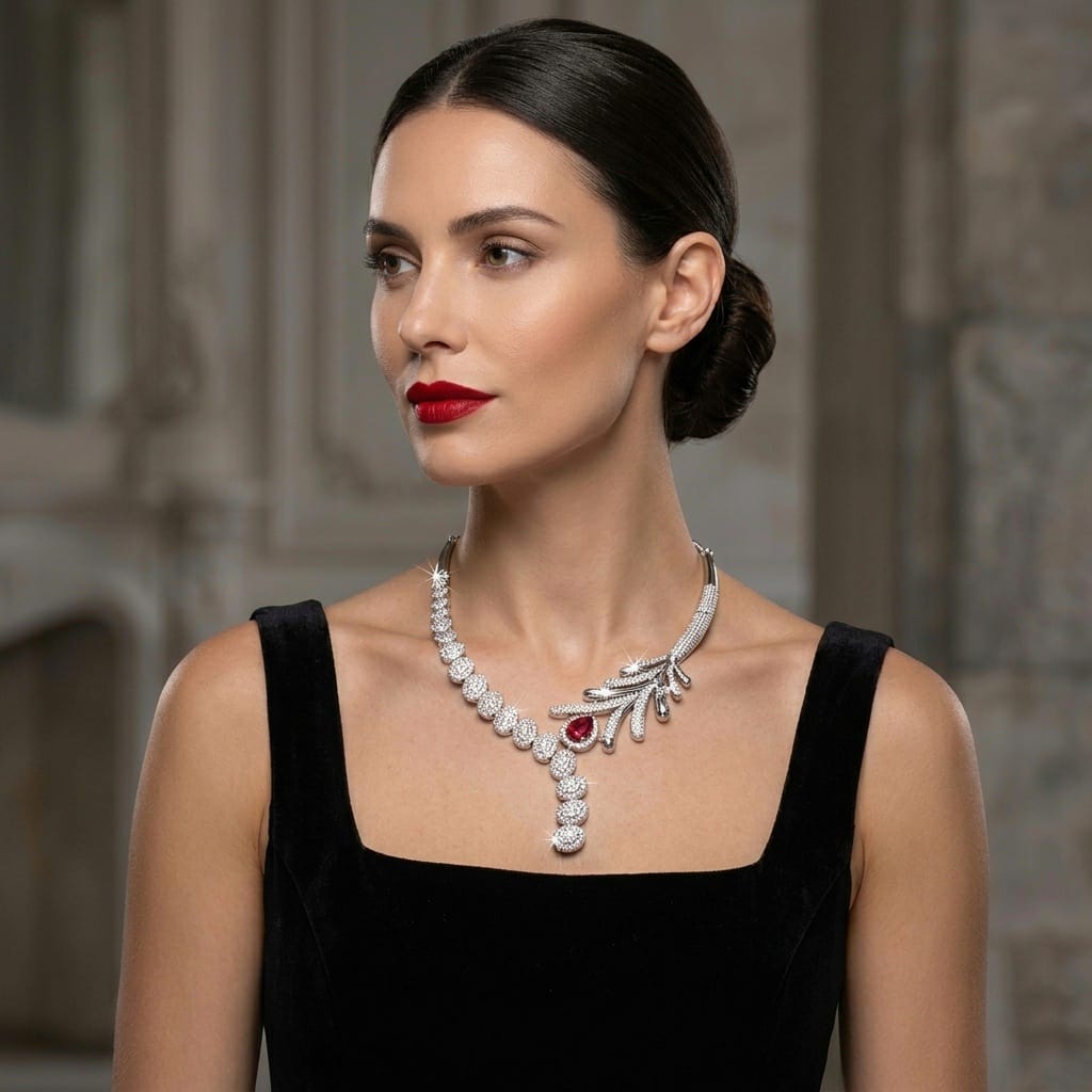 Aesthetic: The combination of the deep red stone against the shimmering white pavé creates a high-contrast, luxurious look suitable for formal evening wear or gala events.