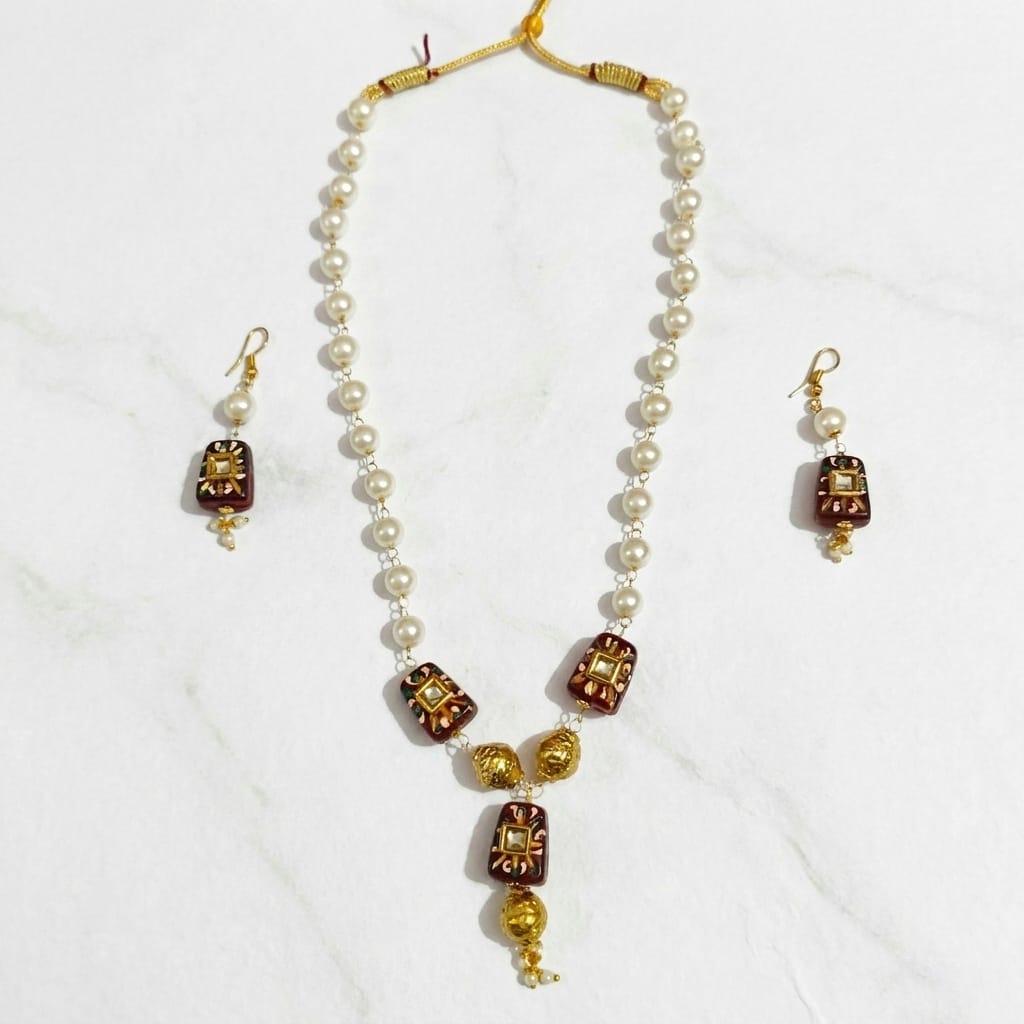 The Design: A classic faux pearl mala accented with three prominent, deep-maroon rectangular focal beads featuring traditional gold-painted detailing and simulated stones.