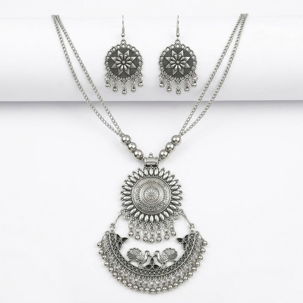 Premium QualityRich in traditional symbolism and majestic scale. This oxidised statement set features a long, double-strand bead chain leading to a spectacular pendant combining a grand sunburst mandala with a peacock-adorned crescent drop. Finished with delicate ghungroo bells and paired with matching circular hook earrings, this set delivers a complete, regal look with an authentic antique finish.