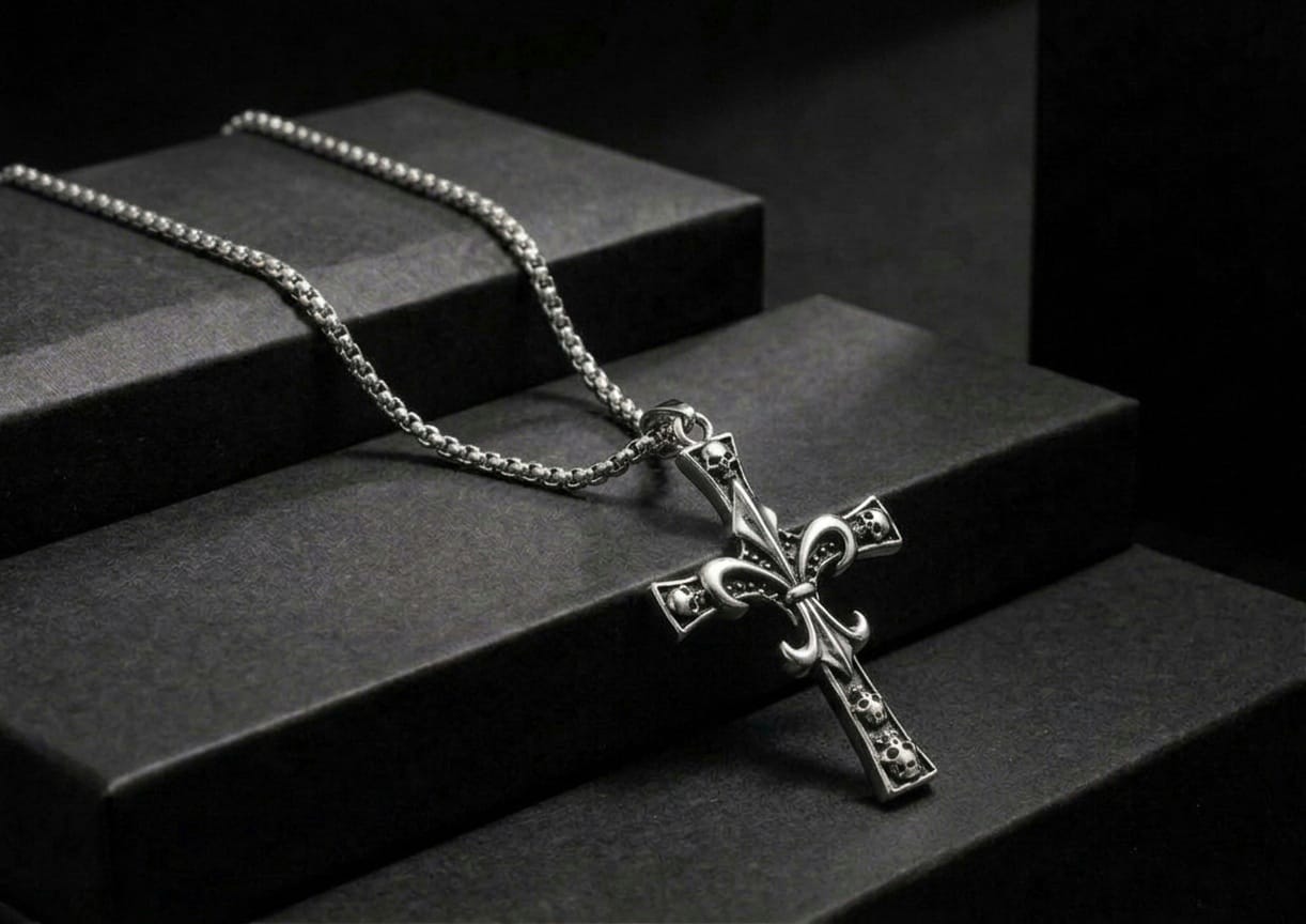 Edgy, intricate, and unapologetically bold. This heavyweight everyday necklace features an antiqued silver-tone cross pendant detailed with a central fleur-de-lis and recessed miniature skulls. Suspended on a durable box chain, it delivers a striking, dark-gothic aesthetic perfect for alternative styling.