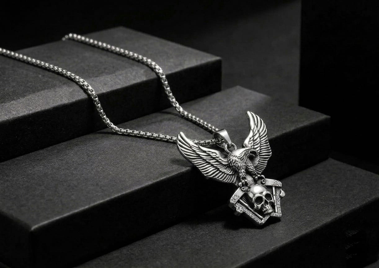 Fierce, rebellious, and masterfully detailed. This heavyweight everyday necklace features an antiqued silver-tone crest pendant showcasing a 3D eagle and skull motif, finished with subtle clear stone accents. Suspended on a durable box chain, it delivers a commanding, biker-inspired aesthetic.