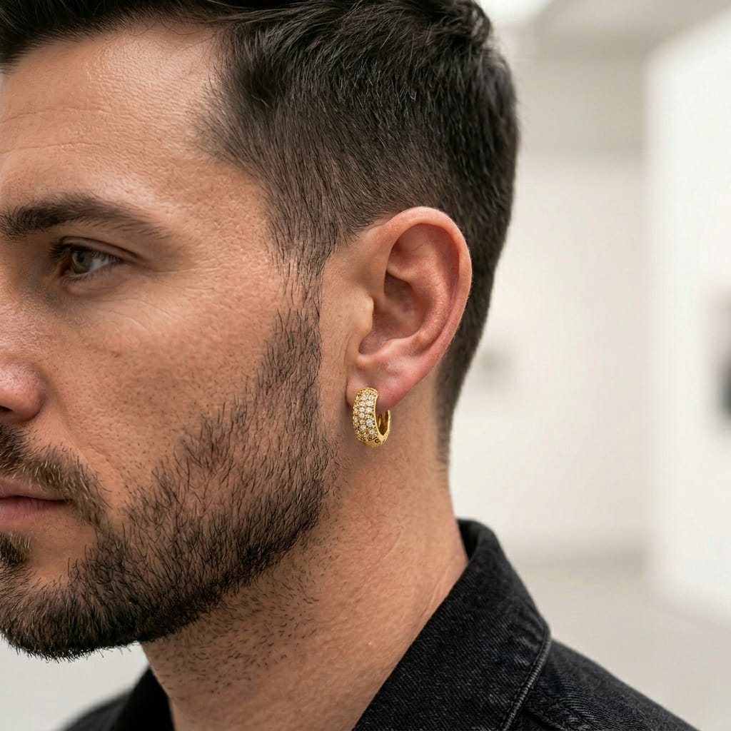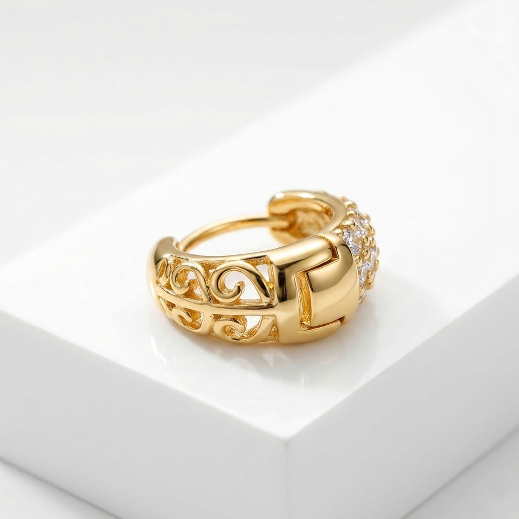 Bold luxury meets masterful craftsmanship. This thick men’s huggie hoop features a high-polish gold-tone finish, a brilliant pave-set stone front, and intricate cutout scrollwork along the sides. Designed with a secure hinged closure, it offers a striking, premium aesthetic for the modern gentleman.