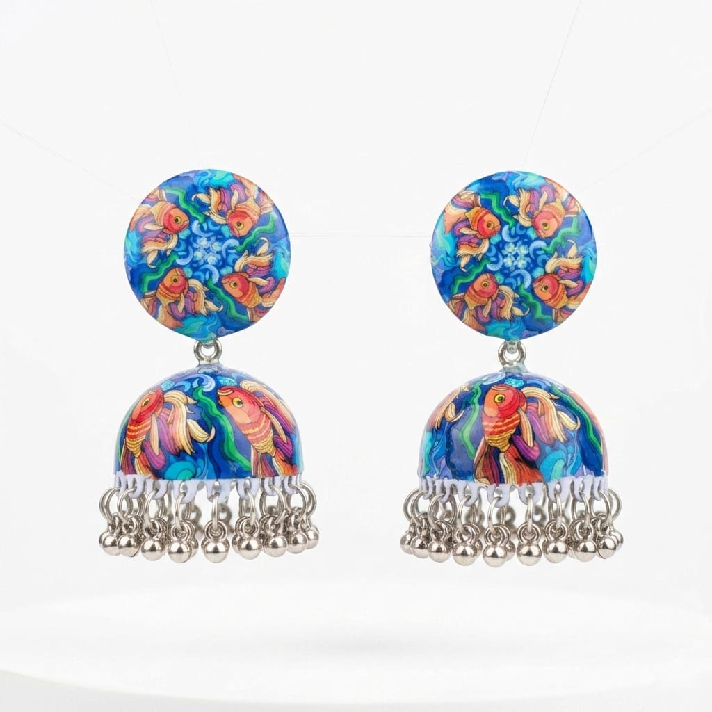 Premium QualityA beautiful fusion of traditional design and playful artistry. These dome-shaped jhumkas feature a glossy, painted motif of Koi fish in swirling blue waters, paired with a matching round stud. A fringe of classic oxidised silver-tone beads finishes the look, offering dynamic movement and a subtle, traditional chime.