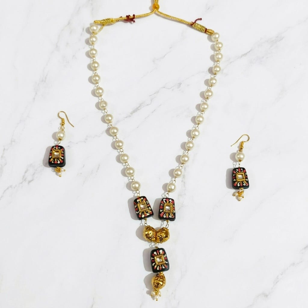 Be the first to review “Pearl & Black Ethnic Motif Necklace Set”