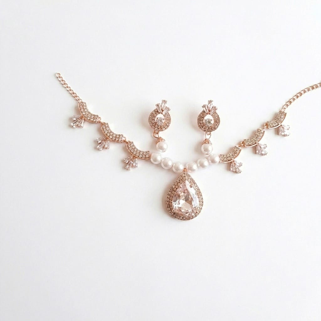 Rose Gold Pearl & Crystal Teardrop Necklace Set