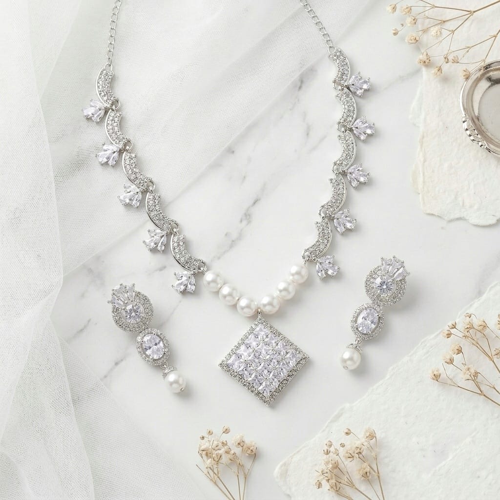Be the first to review “Silver-Tone Crystal & Pearl Geometric Pendant Set”