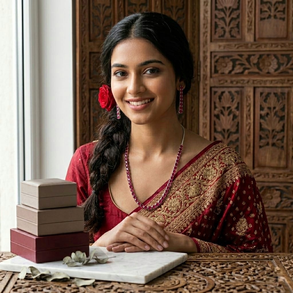 The Stones: Showcases a striking sequence of round-cut, ruby-red American Diamonds, meticulously prong-set to maximize light reflection and mimic the depth of fine rubies.