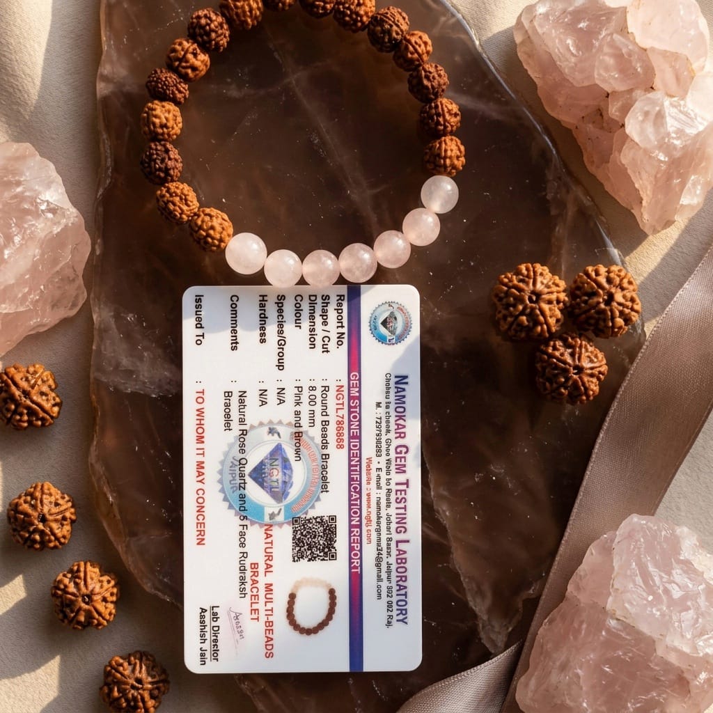 The Guarantee: Purchase with absolute confidence. Every bracelet includes a physical Gem Stone Identification Report from the Namokar Gem Testing Laboratory (NGTL), strictly verifying the natural origin of both the gemstones and the Rudraksha.