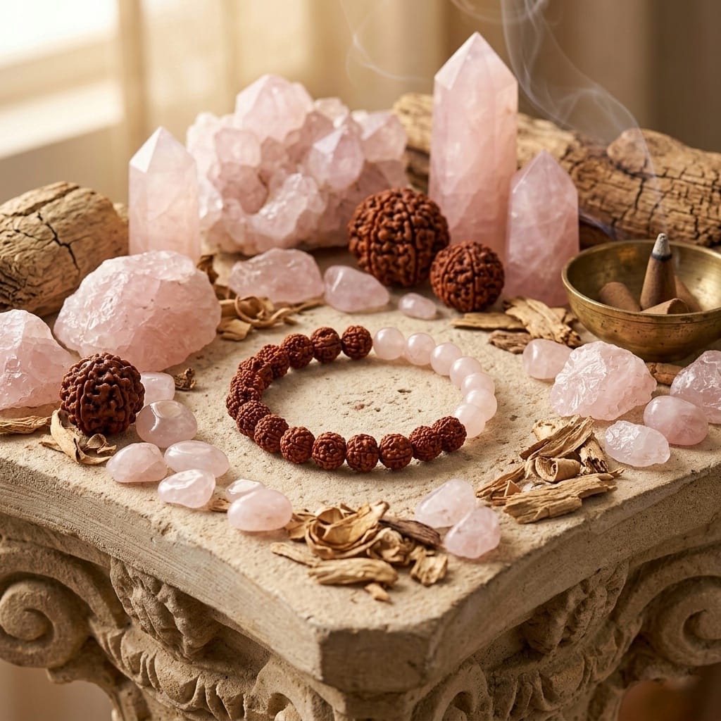 The Energy: Aligns the Heart Chakra (Rose Quartz) while providing overall holistic protection and mental peace (Rudraksha).