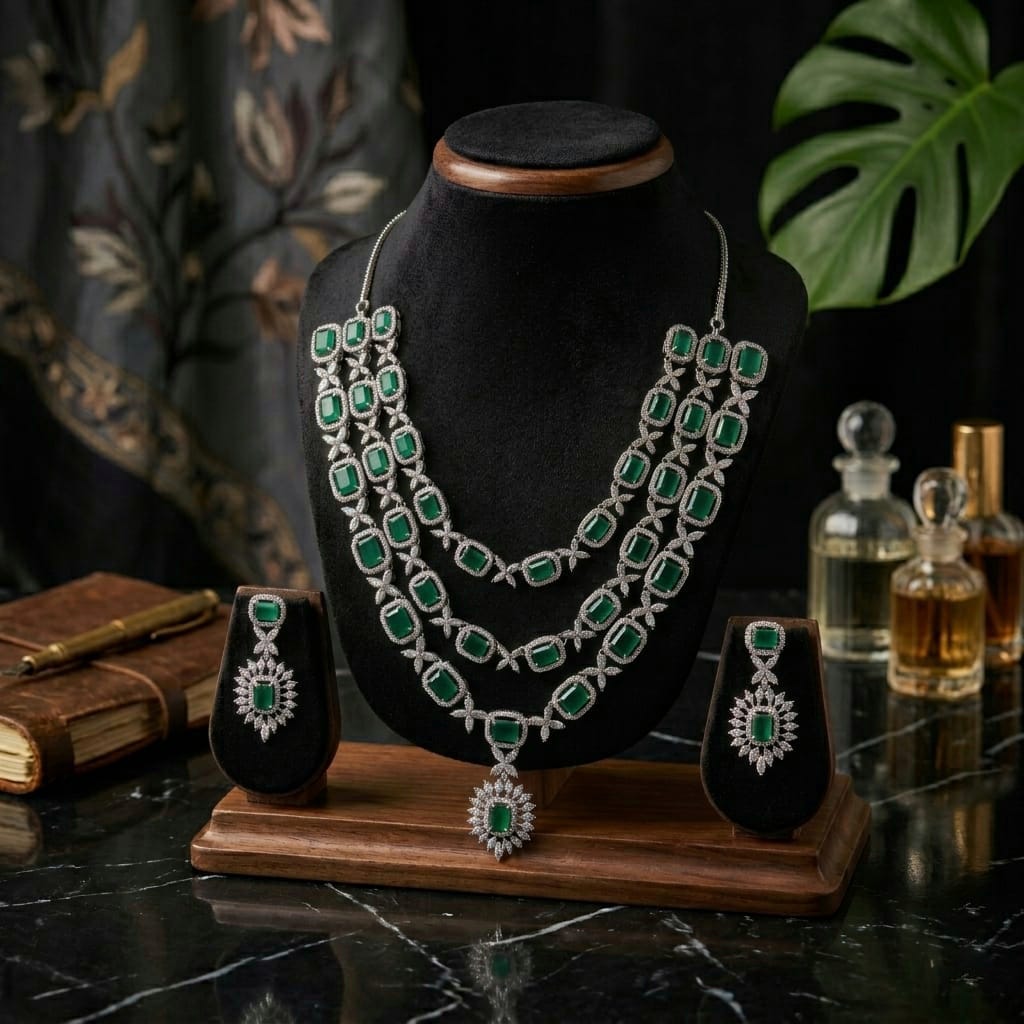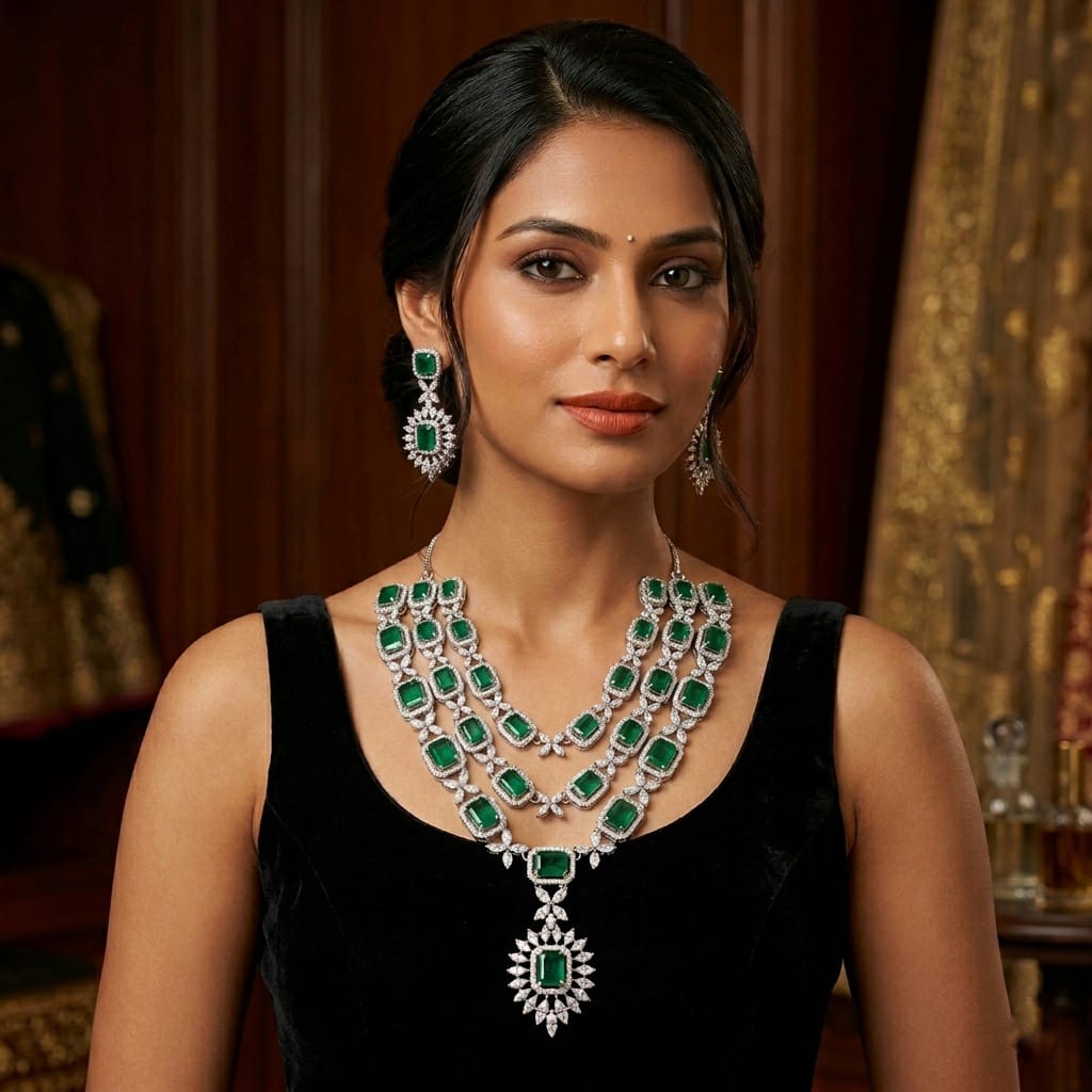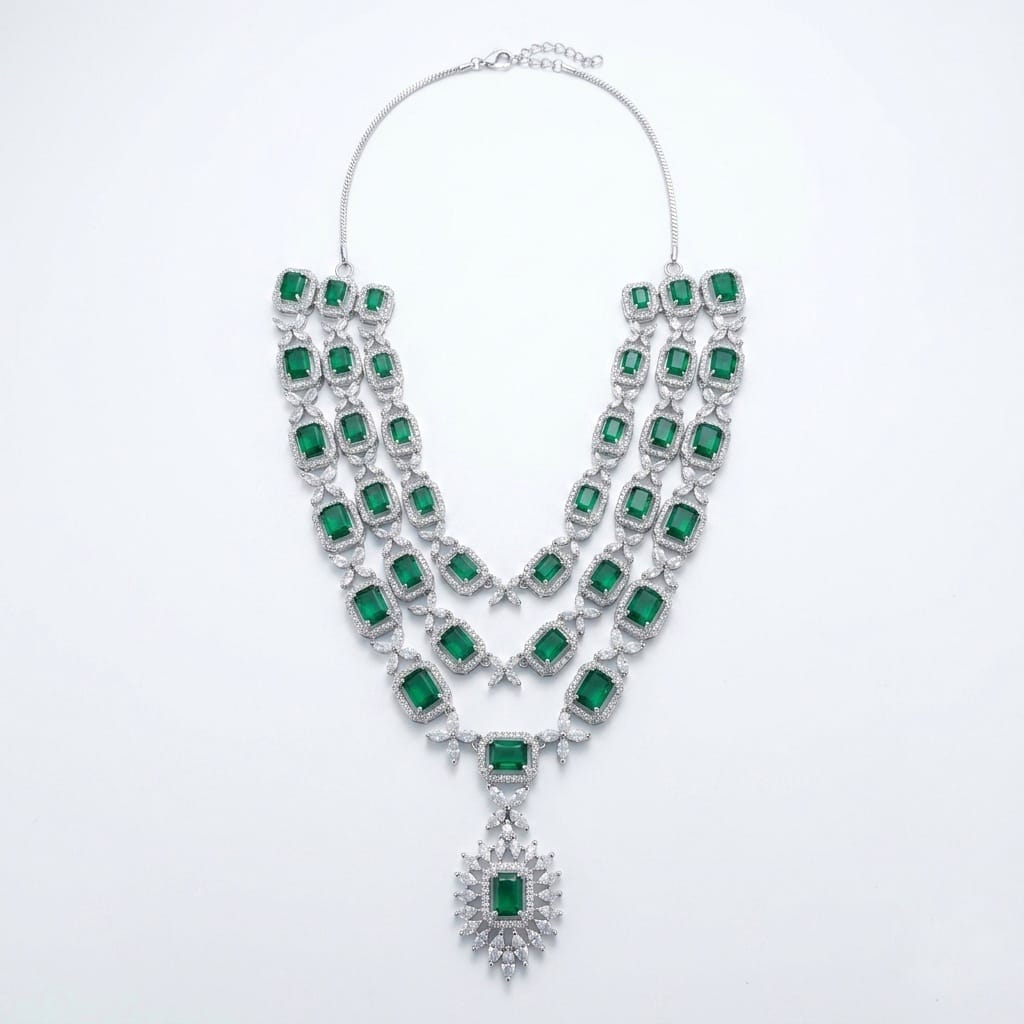 Exude effortless opulence with this breathtaking three-tier statement necklace. Designed for the most prestigious occasions, this piece features a rhythmic arrangement of vibrant, emerald-cut lab-simulated emeralds, each encased in a shimmering halo of brilliant-cut pavé crystals.