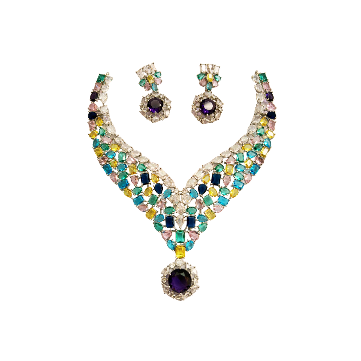 The design is elevated with a striking deep violet centerpiece pendant, framed by shimmering stones that add depth and regal charm. The matching earrings echo the same artistic brilliance, completing the set with perfect symmetry and elegance.